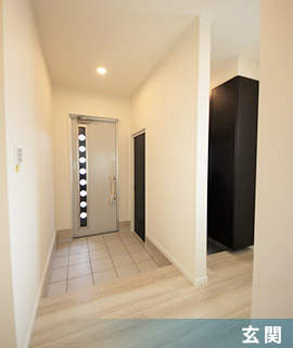 天候を気にせず洗濯物を干すため、2階に物干し室を設けました。 奥様が希望された、家事の最中に作業台として使えるカウンターのような仕様が既製品にはなかったので、その部分は大工さんが造作しました。 システムキッチンも背面にカウンター部分を作っており、とても使い勝手が良さそうです。 玄関中央を壁で仕切り、壁の向こうにシューズクローゼットとコート掛けを設けることで日常の家族の荷物が片付けられ、壁のこちら側の玄関は常にすっきりと保てるようになっています。 間取としてはリビング階段ですが、空調が逃げないよう引き戸で仕切ることができます。 |